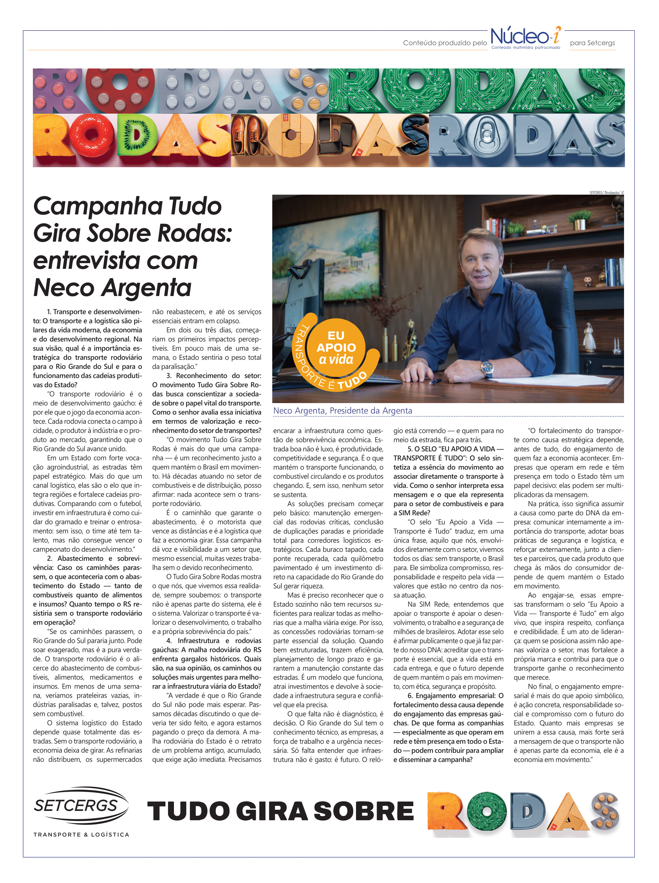 “O transporte rodoviário é o meio de desenvolvimento gaúcho: é por ele que o jogo da economia acontece. Cada rodovia conecta o campo à cidade, o produtor à indústria e o produto ao mercado, garantindo que o Rio Grande do Sul avance unido”, destaca Neco Argenta, presidente da Argenta e da SIM Rede. Em sua avaliação, as estradas vão muito além da função logística: “Mais do que um canal de transporte, elas são o elo que integra regiões e fortalece cadeias produtivas. Comparando com o futebol, investir em infraestrutura é como cuidar do gramado e treinar o entrosamento — sem isso, o time até tem talento, mas não vence o campeonato do desenvolvimento.”
